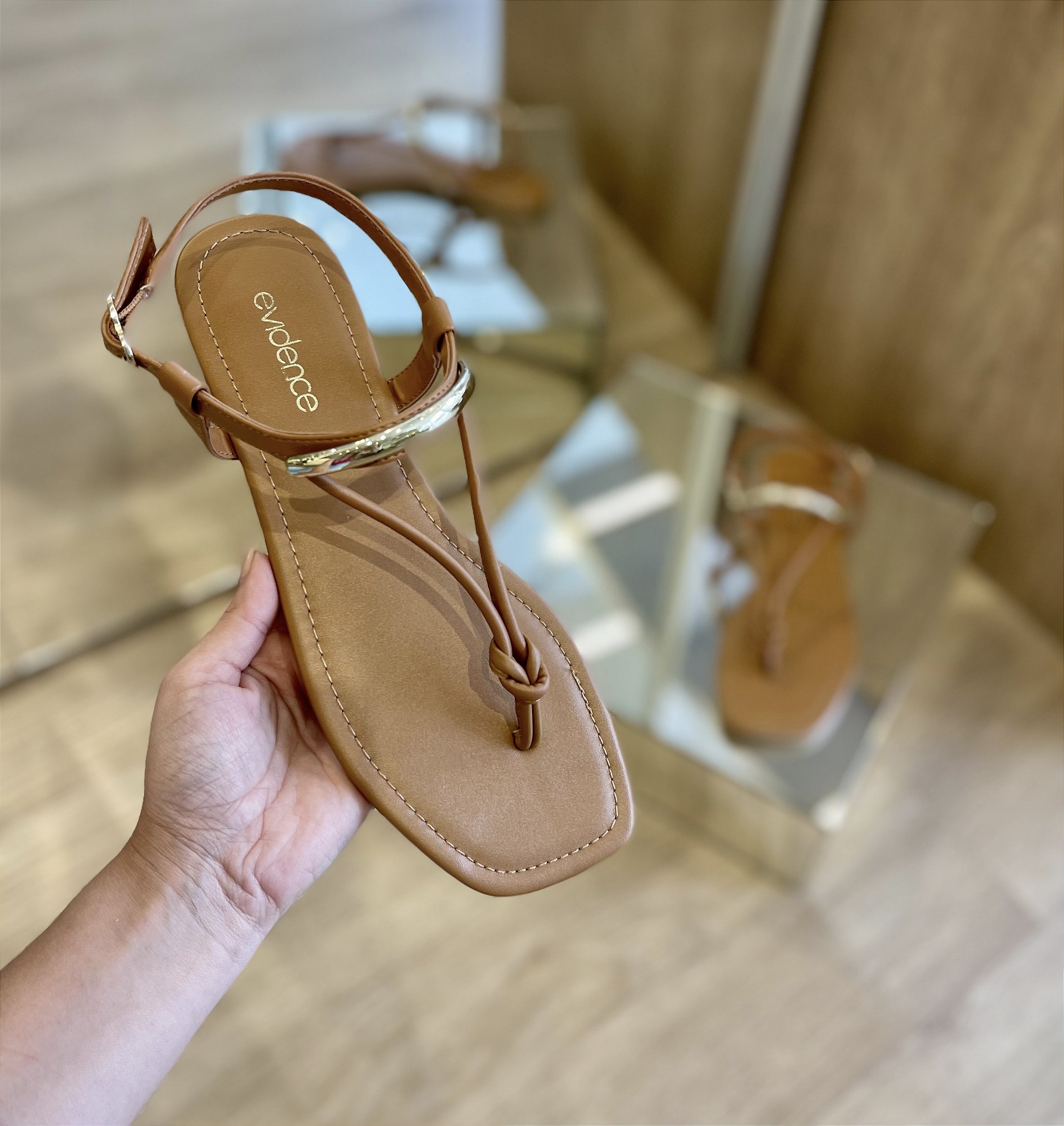 Sinta o conforto e a versatilidade de completar o seu visual com a Sandália Rasteira. A rasteirinha apresenta um detalhe de jóia dourada no tornozelo.
