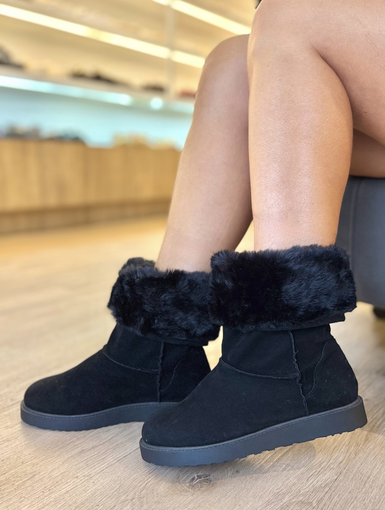 A bota de camurça, cano 2 em 1 medio, toda forrada com pelinho, valoriza o conforto e a praticidade através de um design original. O modelo sem salto traz um visual moderno, facil de calçar, além de super confortavel e quentinha. Ótima opçao para quem gosta de viajar!