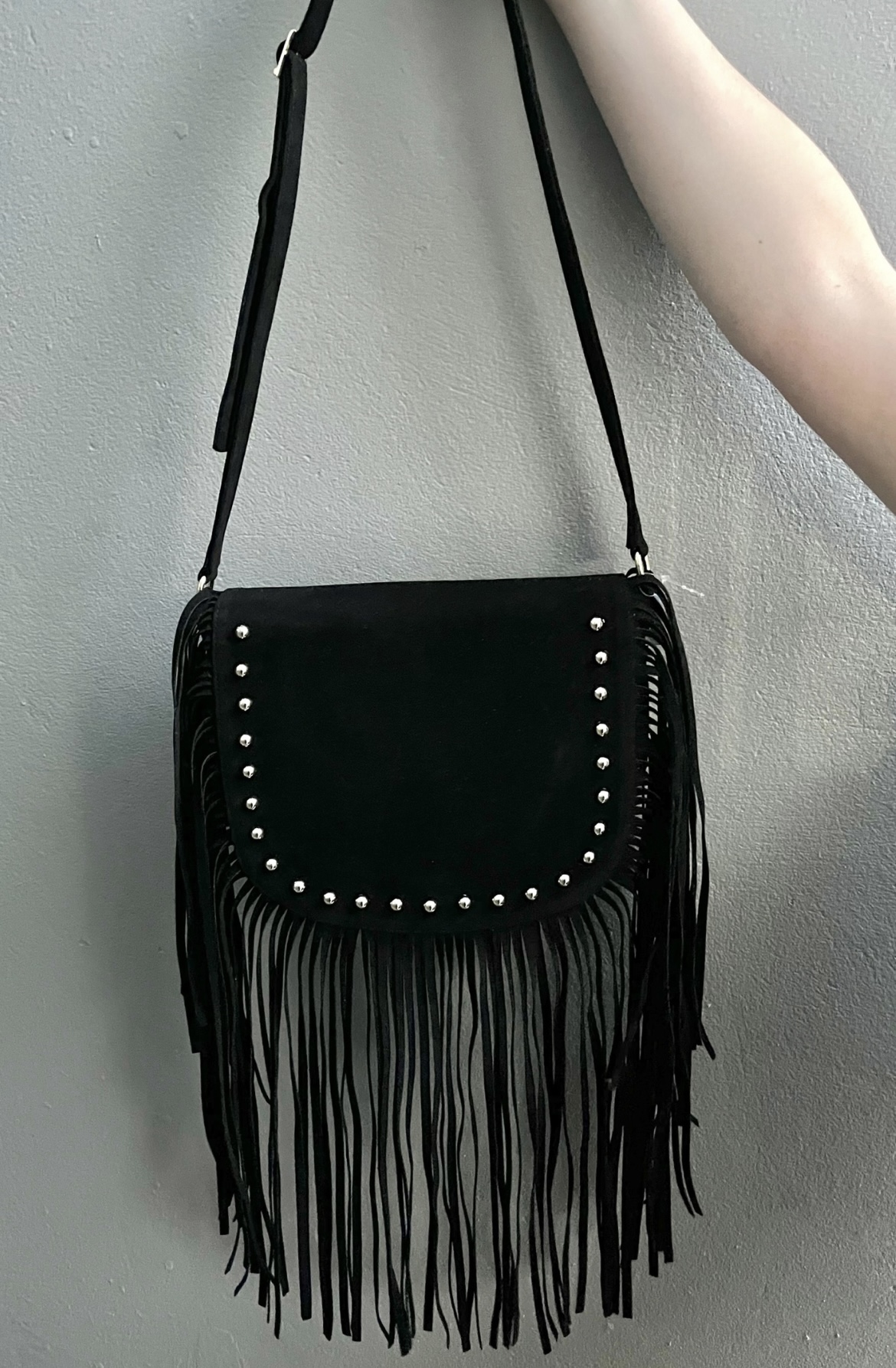 Bolsa Preta Camurça Com Aplicações Dourada E Franja Viena
