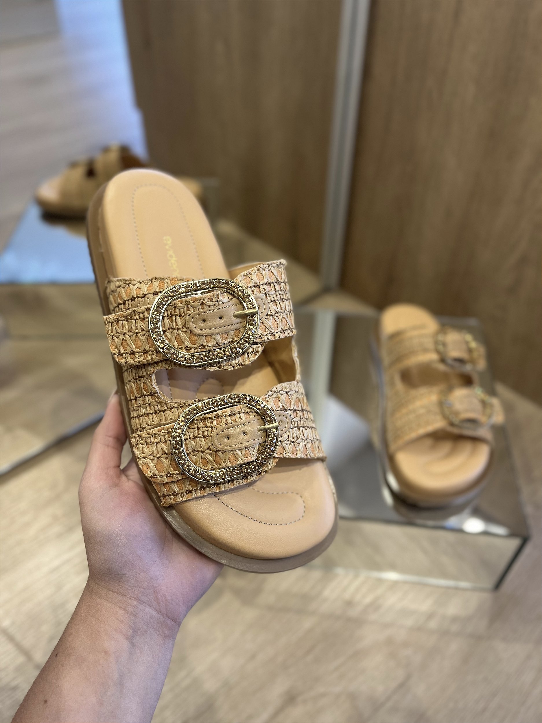 Nossa papete Fabi possui duas tiras com um detalhe de fivela dourada, com strass dourado, e trabalhado de palha. Possui um solado de 3cm toda emborrachada, que traz mais conforto e segurança ao caminhar. Aposte nessa nova tendência que vem com tudo!