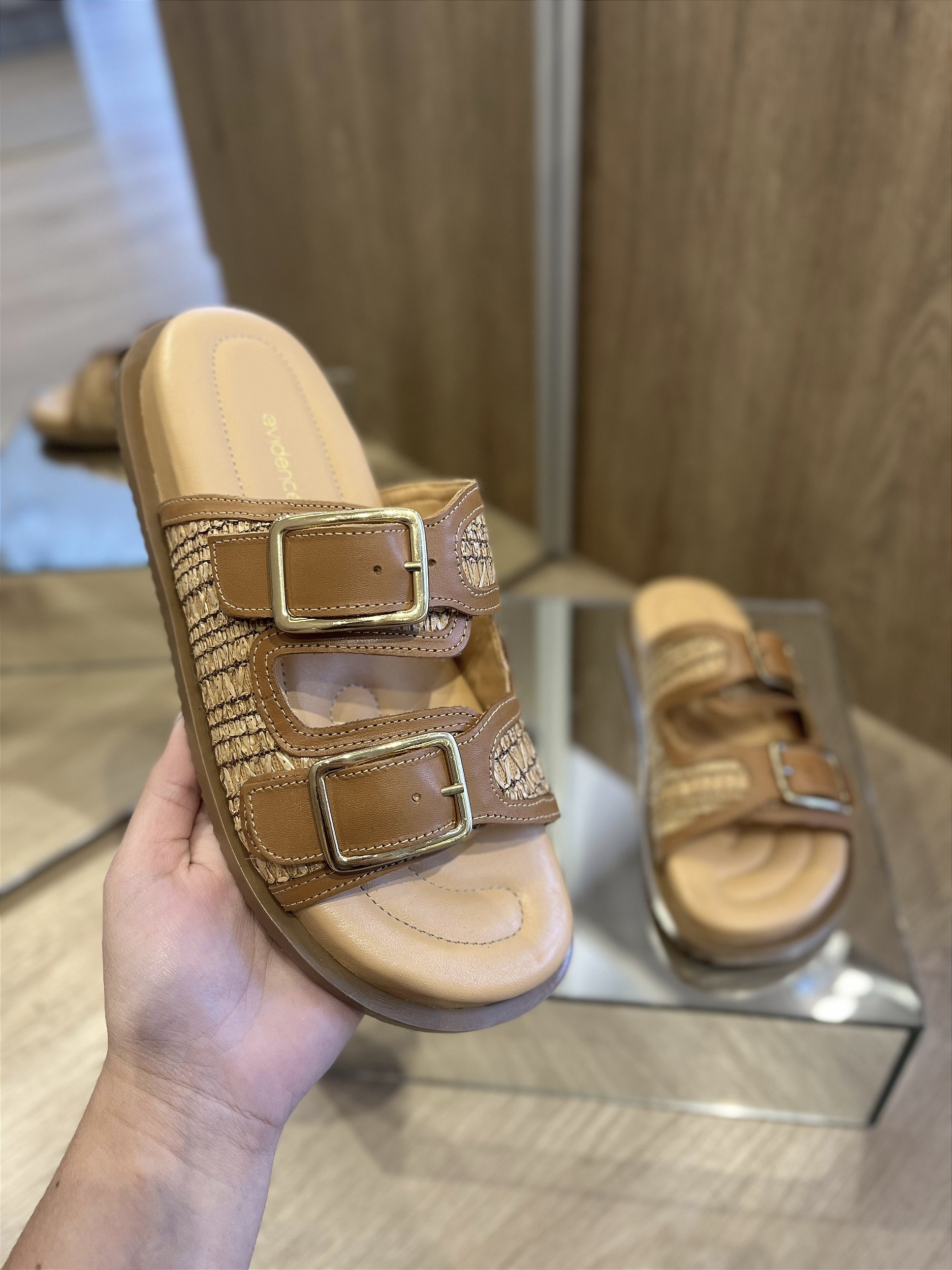 Nossa papete Mel possui duas tiras com um detalhe de fivela dourada, e trabalhado de palha. Possui um solado de 3cm todo emborrachado, que traz mais conforto e segurança ao caminhar. Aposte nessa nova tendência que vem com tudo!