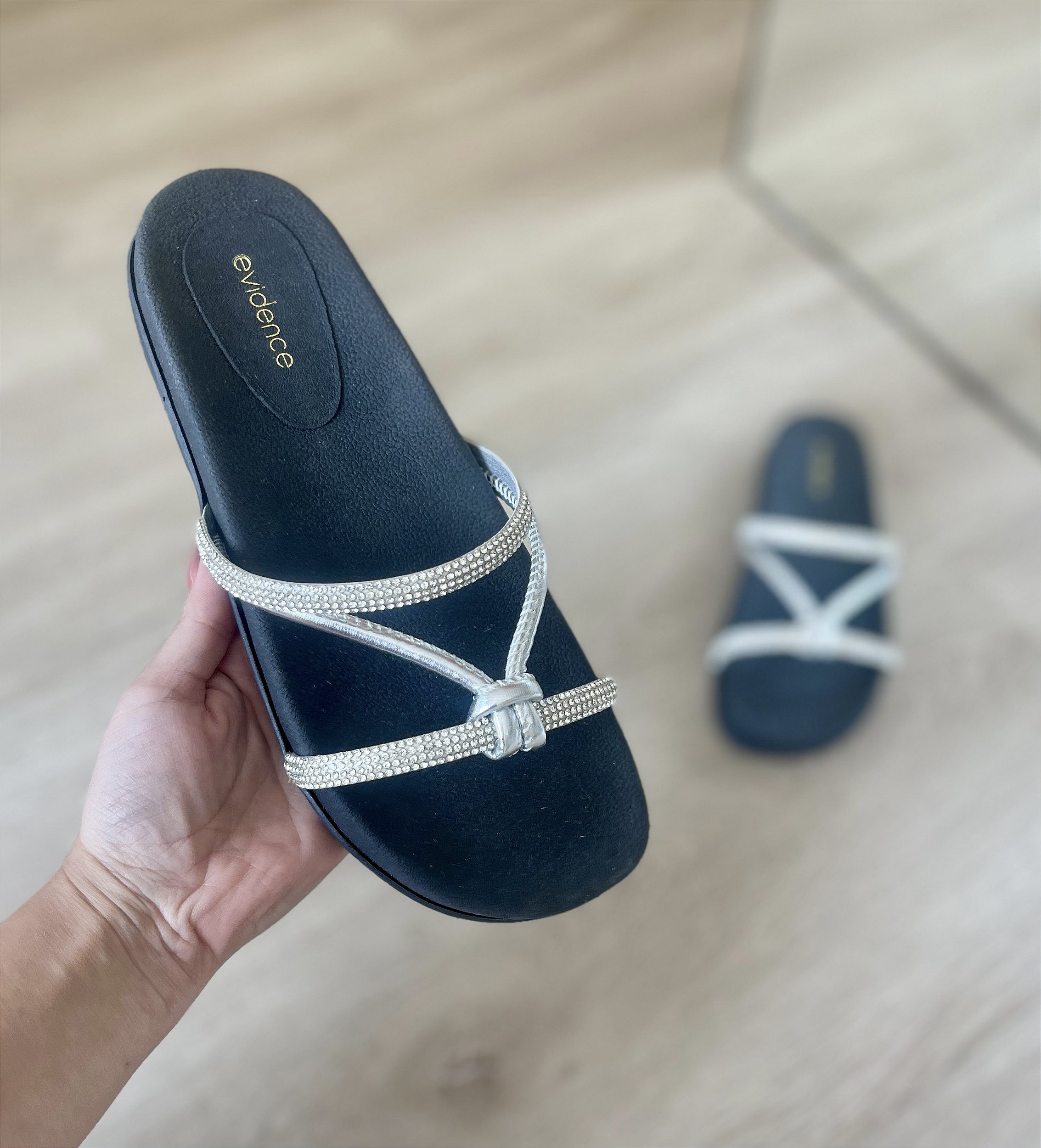 A nossa papete Bel traz um toque charmoso com suas tiras brilhosas. Confortável, e muito estilosa! Aposte nessa tendência e arrase!