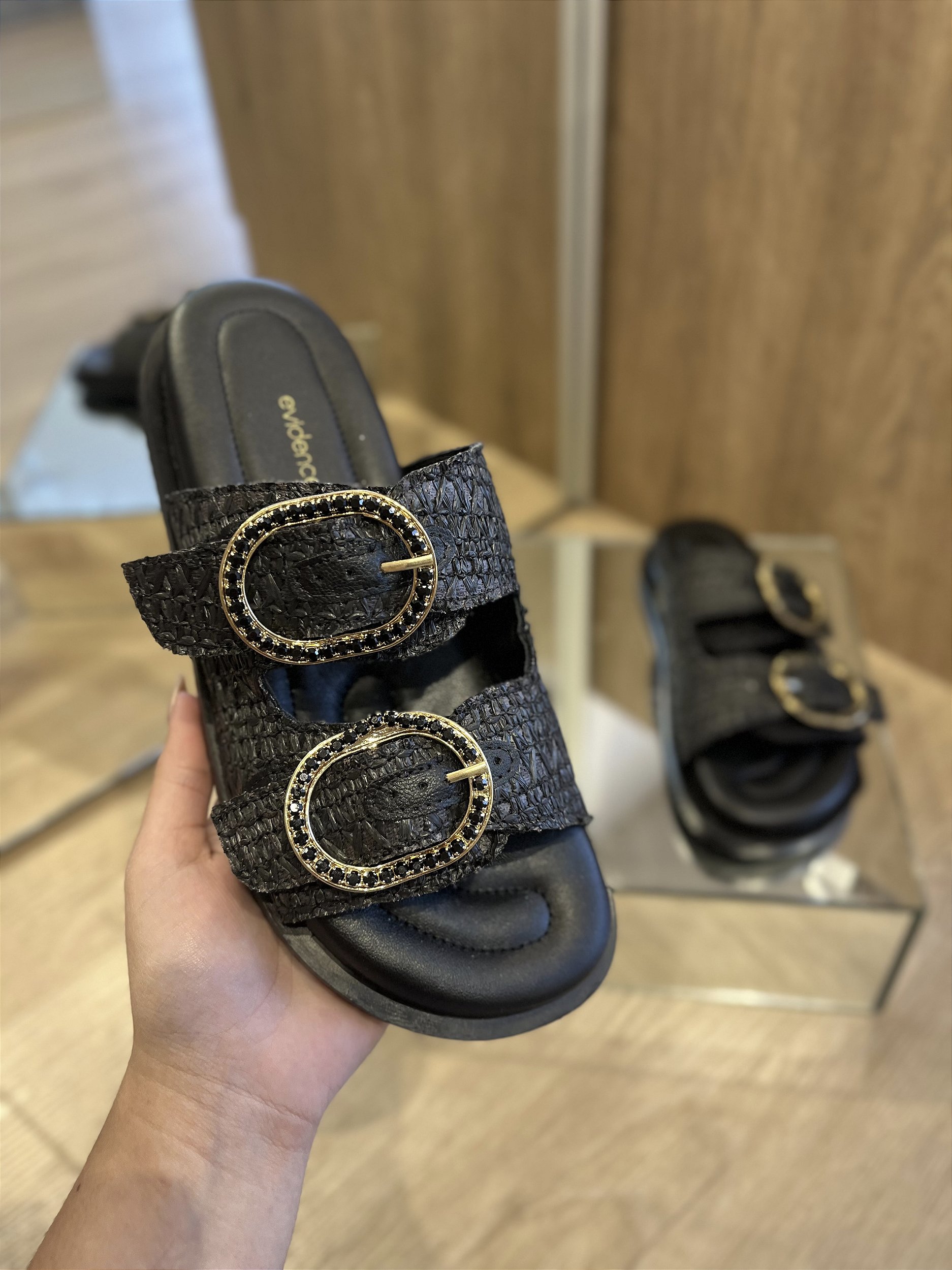 Nossa papete Fabi possui duas tiras com um detalhe de fivela dourada, com strass preto, e trabalhado de palha. Possui um solado de 3cm toda emborrachada, que traz mais conforto e segurança ao caminhar. Aposte nessa nova tendência que vem com tudo!