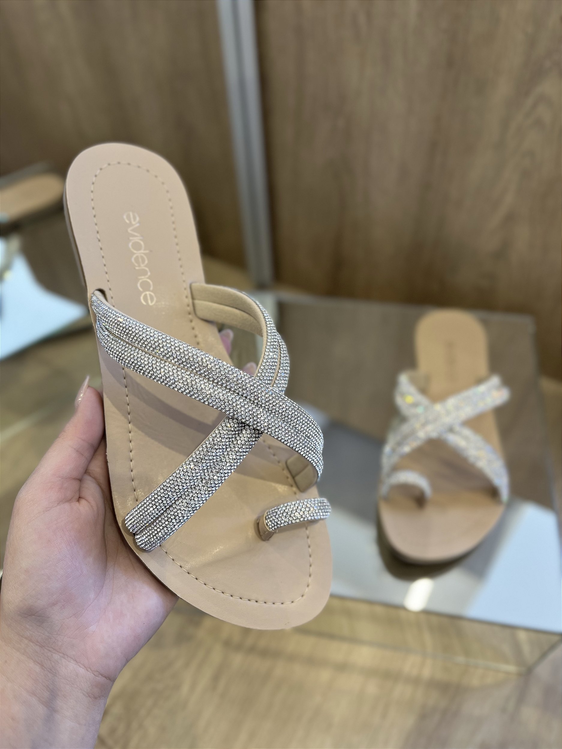 Rasteira Bege Com Tiras Em Strass Prata Tamy