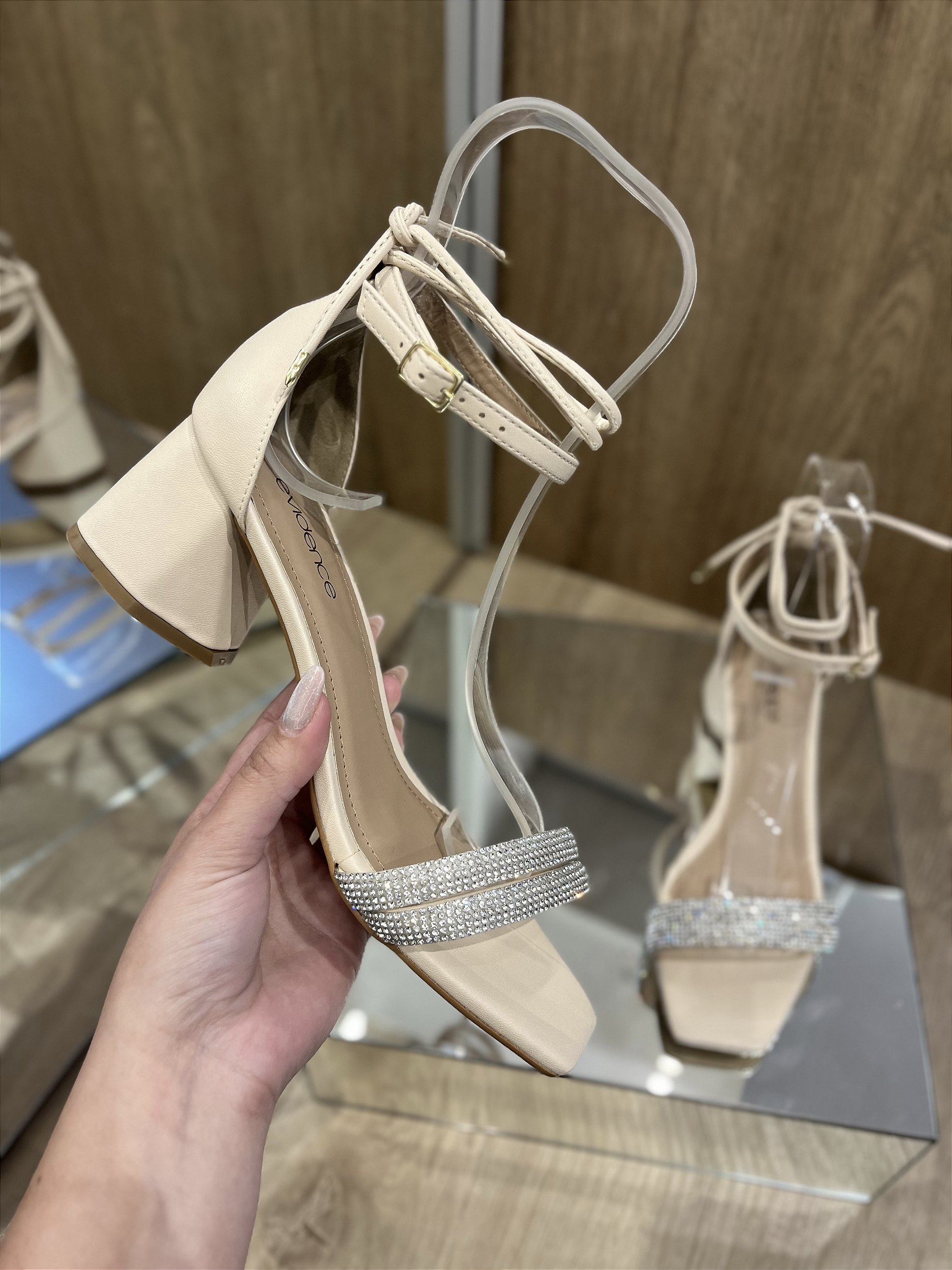 Nossa sandália Kay possui duas tiras frontais com brilhos, bico levemente quadrado, salto bloco de 5cm, e tiras para amarração que são opcionais. Aposte nessa tendência que vem com tudo nesse verão, e arrase!