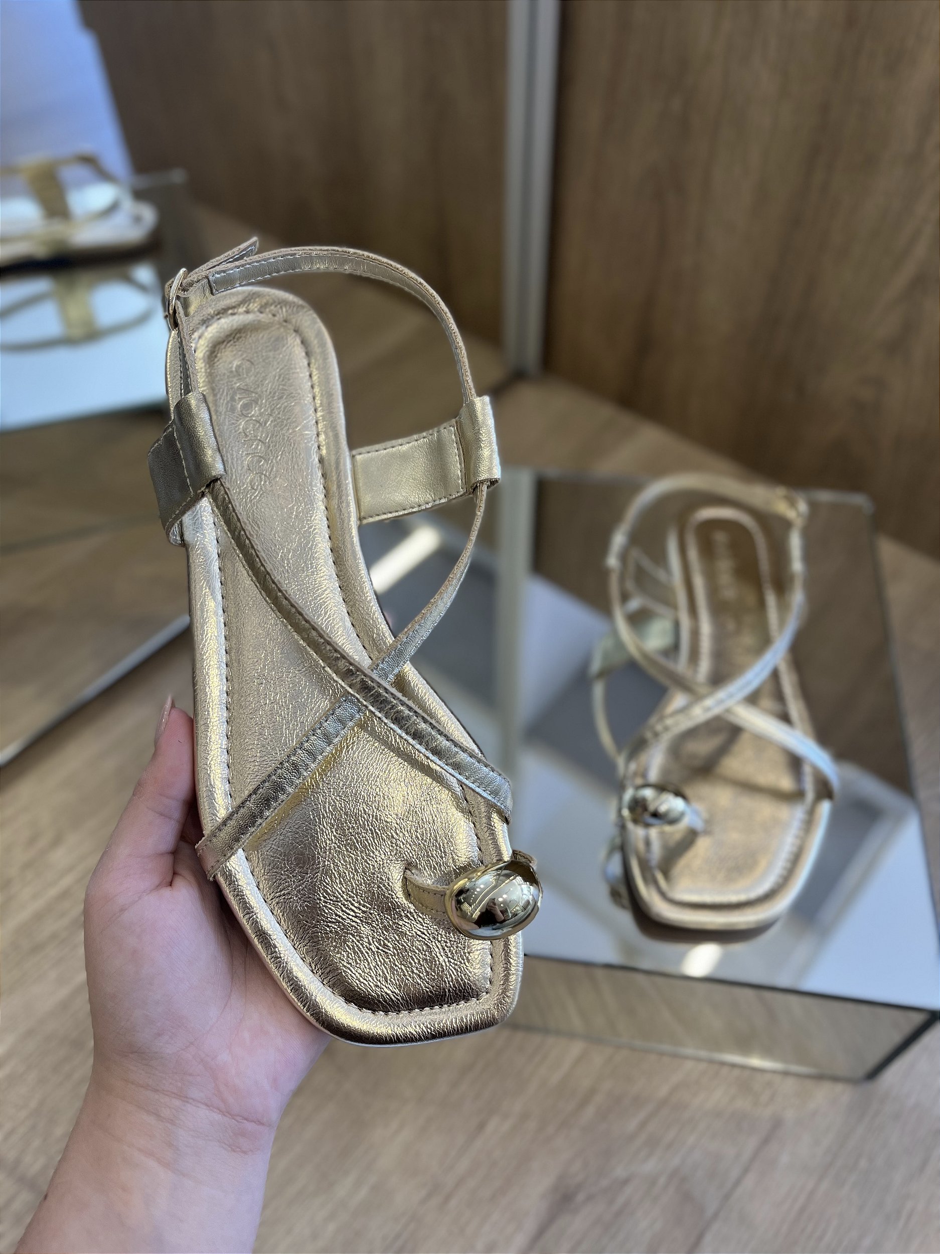 Sandália Rasteira Dourada Em Couro Com Aplicação Monique