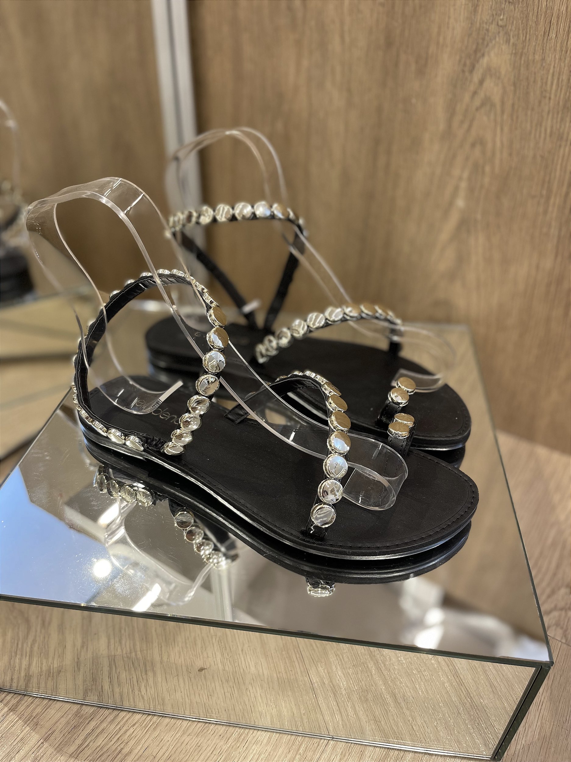 Sandália Rasteira Preta Com Detalhes Dourados Elis