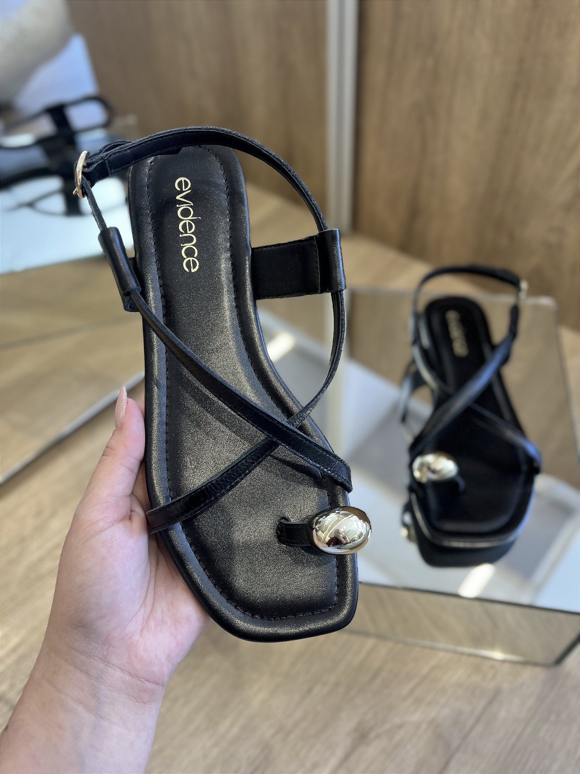 Sandália Rasteira Preta Em Couro Com Aplicação Monique