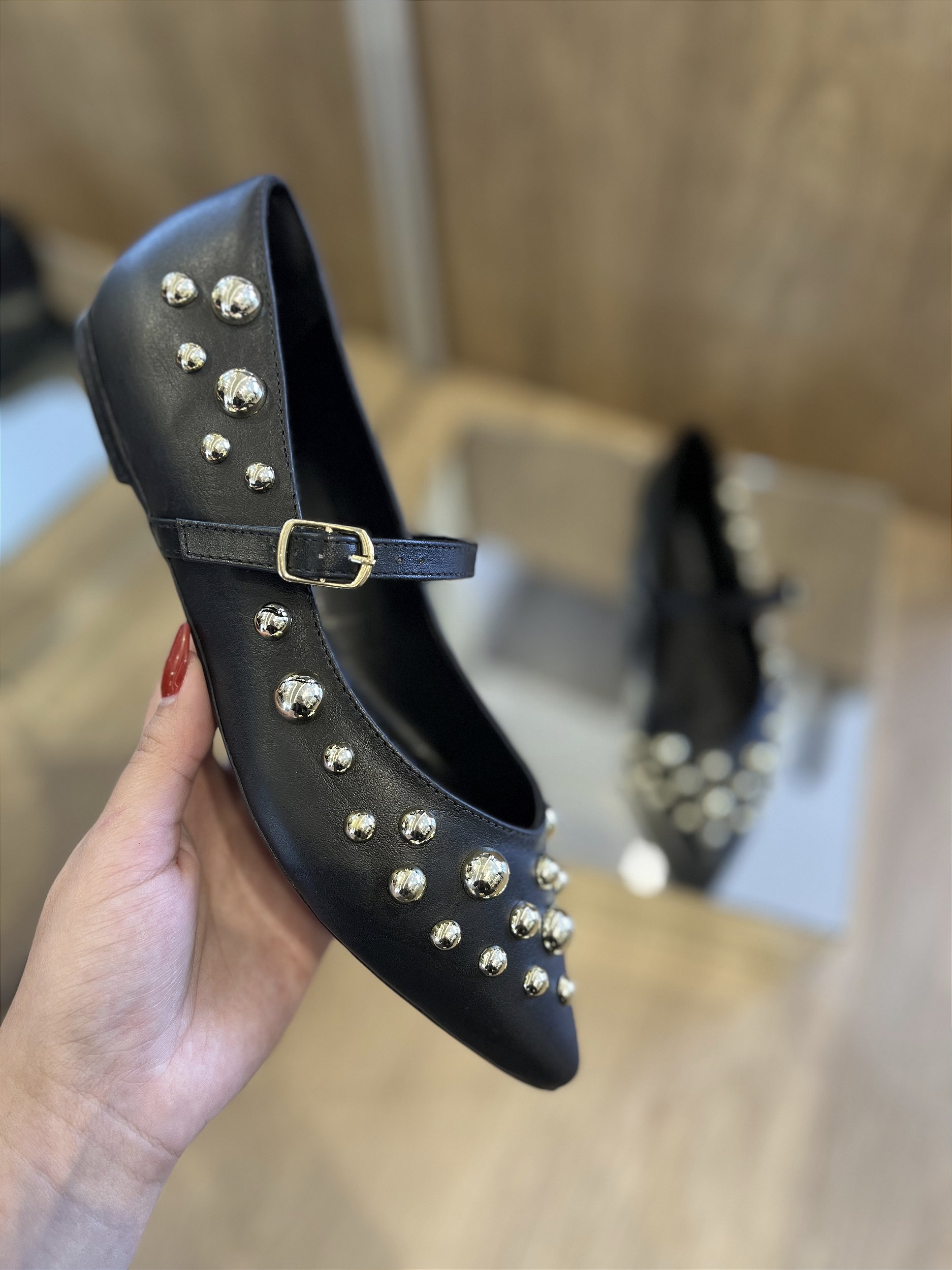 Sapatilha Preto Em Couro Com Aplicações Dourada Jani
